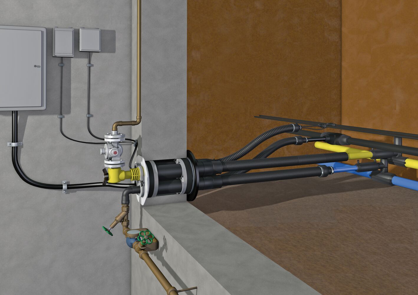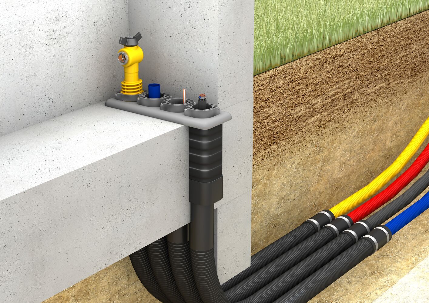 Bei Gebäuden mit Keller können wir die Mehrspartenhauseinführung (Wandeinführung) nur liefern und einbauen, sofern der Tiefbau von uns durchgeführt wird. Alternativ kann die Mehrspartenhauseinführung auch von Ihnen bereitgestellt und montiert werden.